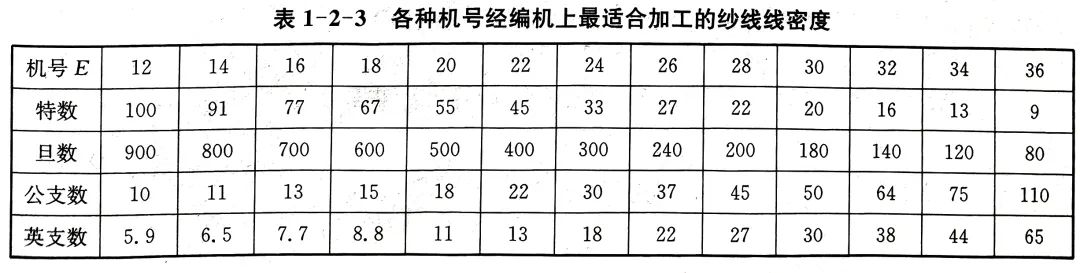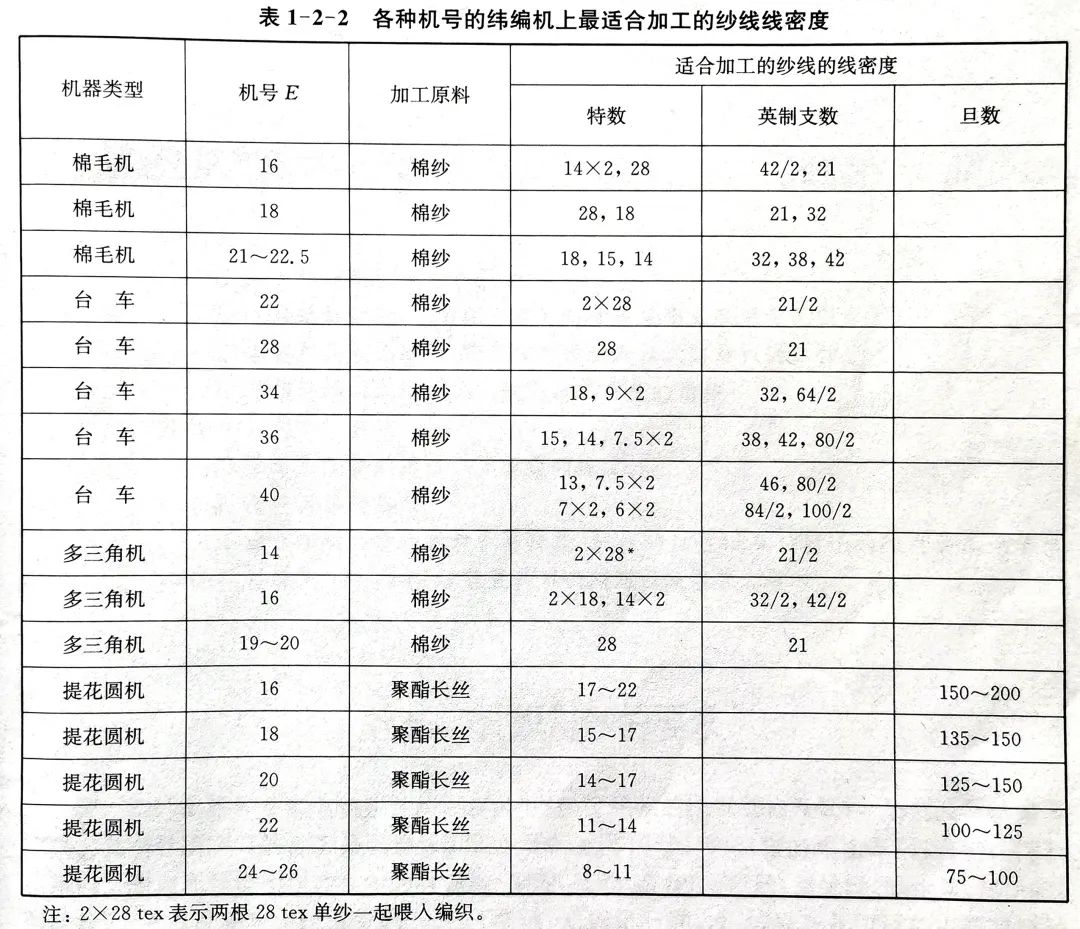 在實際生產(chǎn)中,一般根據(jù)織物的有關(guān)參數(shù)和經(jīng)驗確定機(jī)號的針織機(jī)上最適合加工的紗線線密度,如表1-2-2所列為各種機(jī)號的緯編機(jī)上最適合的紗線線密度,表1-2-3所列為各種機(jī)號的經(jīng)編機(jī)上最適合的紗線線密度。