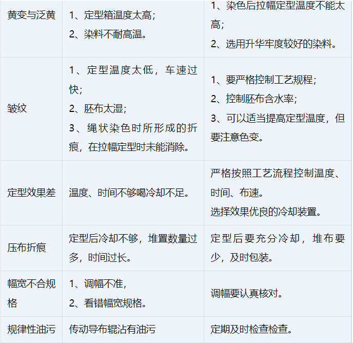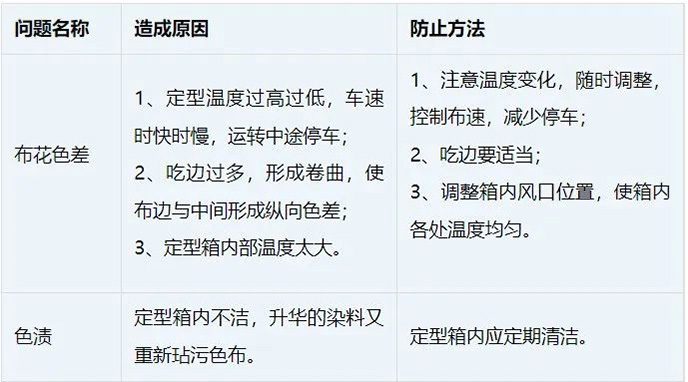 如果熱定形溫度過低,時間過短均能造成織物表面不平整、不挺括、門幅收縮等疵病,失去定形作用;如定形溫度過高或時間過長,會造成織物發(fā)硬變脆,強力下降,彈性降低并能使某些分散染料升華而產生色差,嚴重的甚至能使纖維熔融。