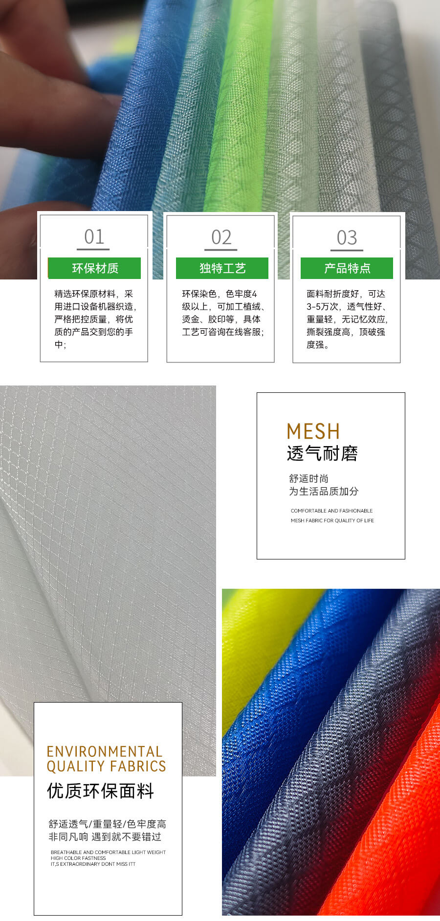 優(yōu)點(diǎn)是透氣、韌性足、耐磨、耐腐蝕。面料使用壽命長(zhǎng)。非常適用于運(yùn)動(dòng)鞋、休閑鞋、帽子、沙灘包等產(chǎn)品。